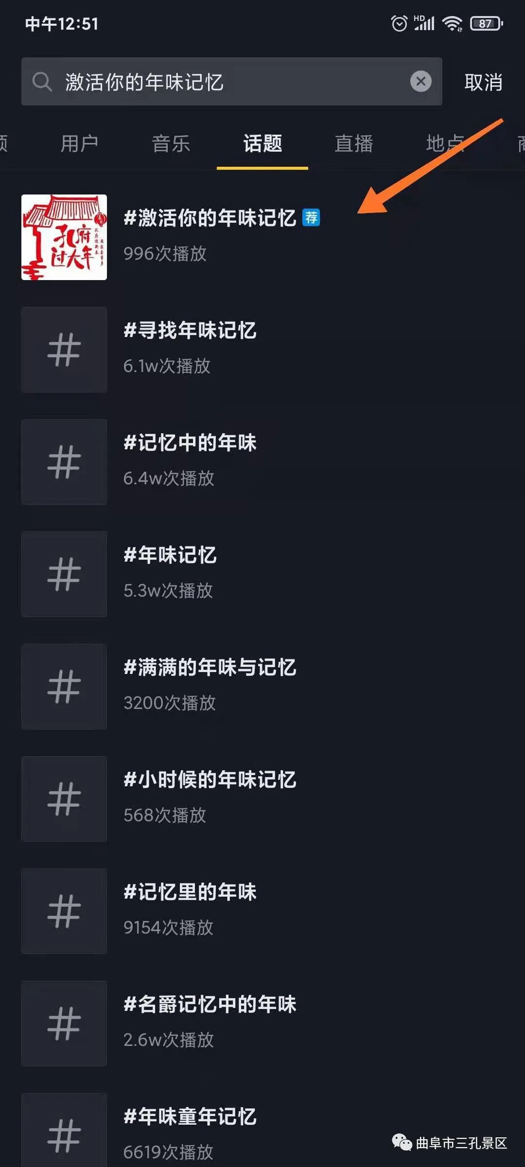 第二步:搜索 “激活你的年味記憶”,選擇“話題”搜索;