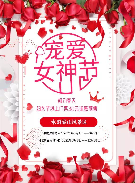 為慶祝2021年3月8日第111個國際婦女節(jié),水泊梁山風(fēng)景區(qū)推出“相約春天婦女節(jié)門票半價預(yù)售”活動。